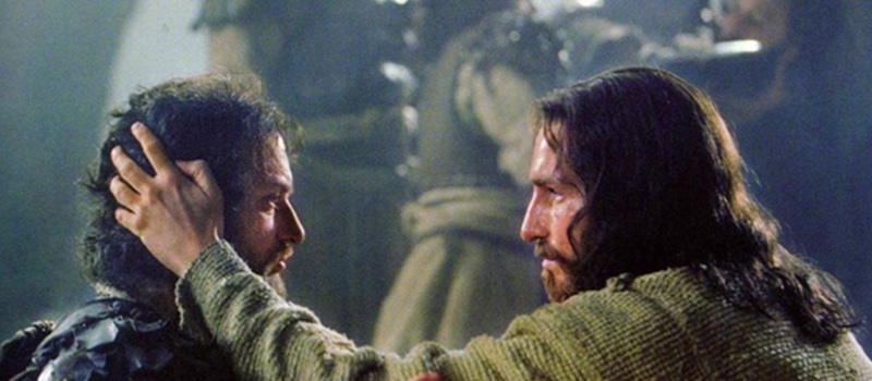 Jesus takes the bloody ear and heals the enemy.